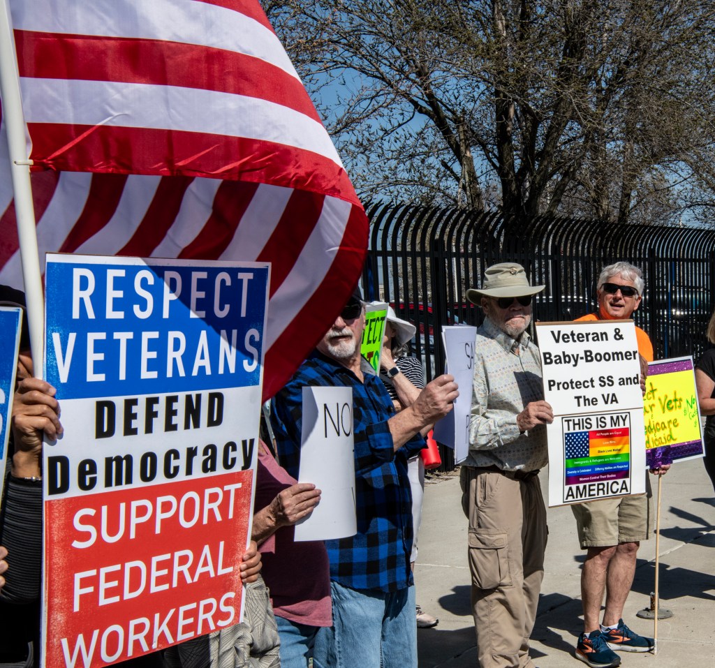 Friday kicked off a weekend of local protest activity, when veterans and their supporters took to the streets to protest proposed budget cuts at the Veterans Administration (VA). These cuts are part of the Trump administration’s DOGE effort. After gathering at John Cochran VA Medical Center in N. Grand, protesters made their way to Grand Center, taking their message to the city’s main arts and culture district. This was one of many similar protests that took place across the nation.