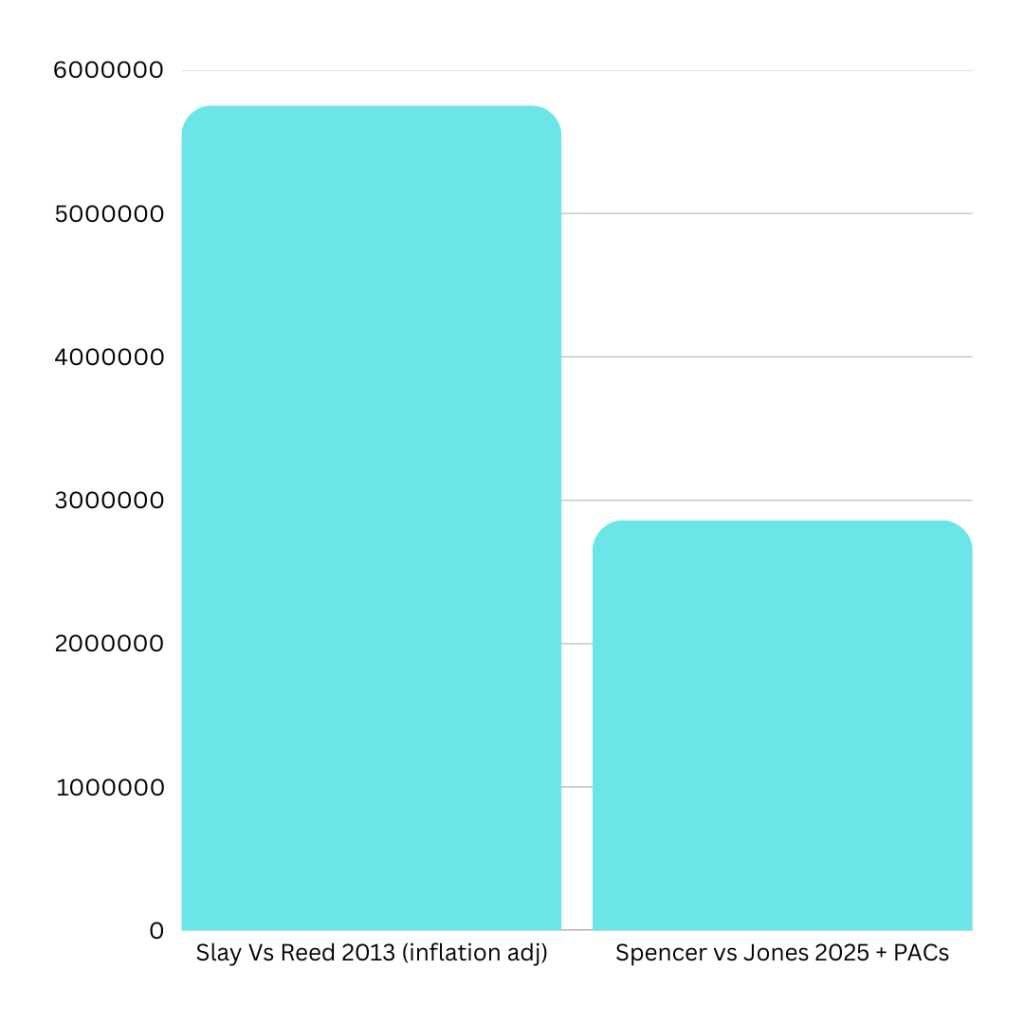 Between smaller spending totals, the impact of twelve years’ inflation, and continued voter turnout in municipal elections, it is clear that running for mayor has become a relatively cheaper affair. Spending per voter was almost $91 in 2013. If 47,000 voters turn out in this year’s general election, this figure would fall to about $60 per vote. If next Tuesday’s turnout matches 2021’s almost 59,000 voters, the amount spent per vote falls further to $47 per voter. In either scenario, it is clear that overall spending in the city’s mayoral elections has declined.