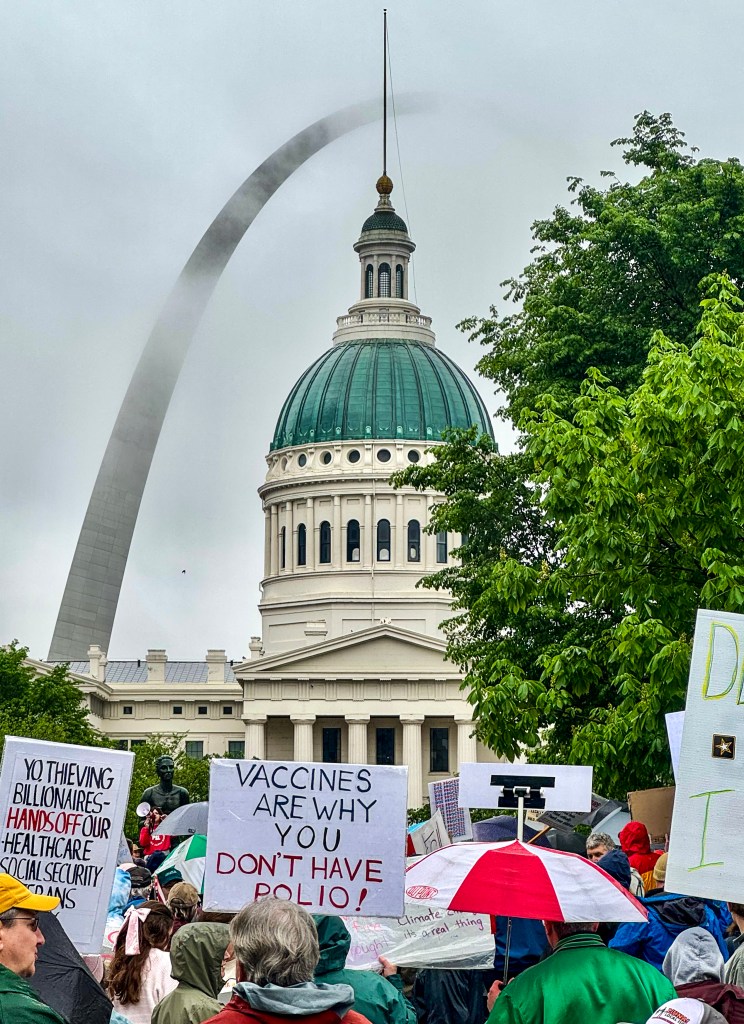 Despite dreary weather and a steady drizzle, more than two hundred demonstrators gathered in downtown St. Louis on Saturday, April 19, 2025, for the March for Science. Armed with umbrellas, rain ponchos, homemade signs, and the desire to make their voices heard, participants rallied to promote science-based policy, environmental protection, and continued investment in scientific research and education.