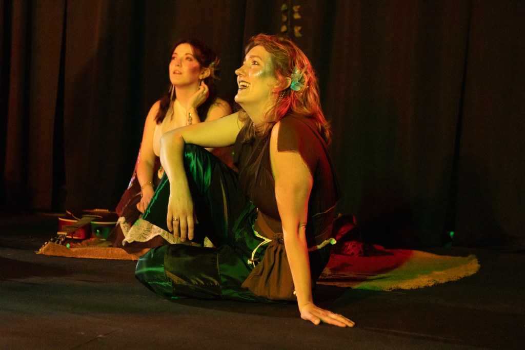 Ozark, a rebellious, wildly free-spirited and forward-thinking nymph associated with a lake, transforms the ritual into revelry and music, pines for Peyto’s affection, and confronts the ceremony’s history with the stories she’s heard. They’re also incredibly empathetic and very protective of Echo. Ferrari brings brutal honesty and a sensual fire that keeps the emotional dynamics of the play in flux. The choices are satisfying and authentic, and the energy is full of determination and action. Echo, the only nymph not born from a natural element, has secrets she cannot simply tell as she can only repeat the words of others. Baer’s Echo picks those words carefully adding emotion and context using her entire physical being. From breath and posture to expression and reaction, Baer’s every movement illuminates the sense of loss, confusion, and uncertainty as well as the longing and hopeful reconciliation that permeate the play.