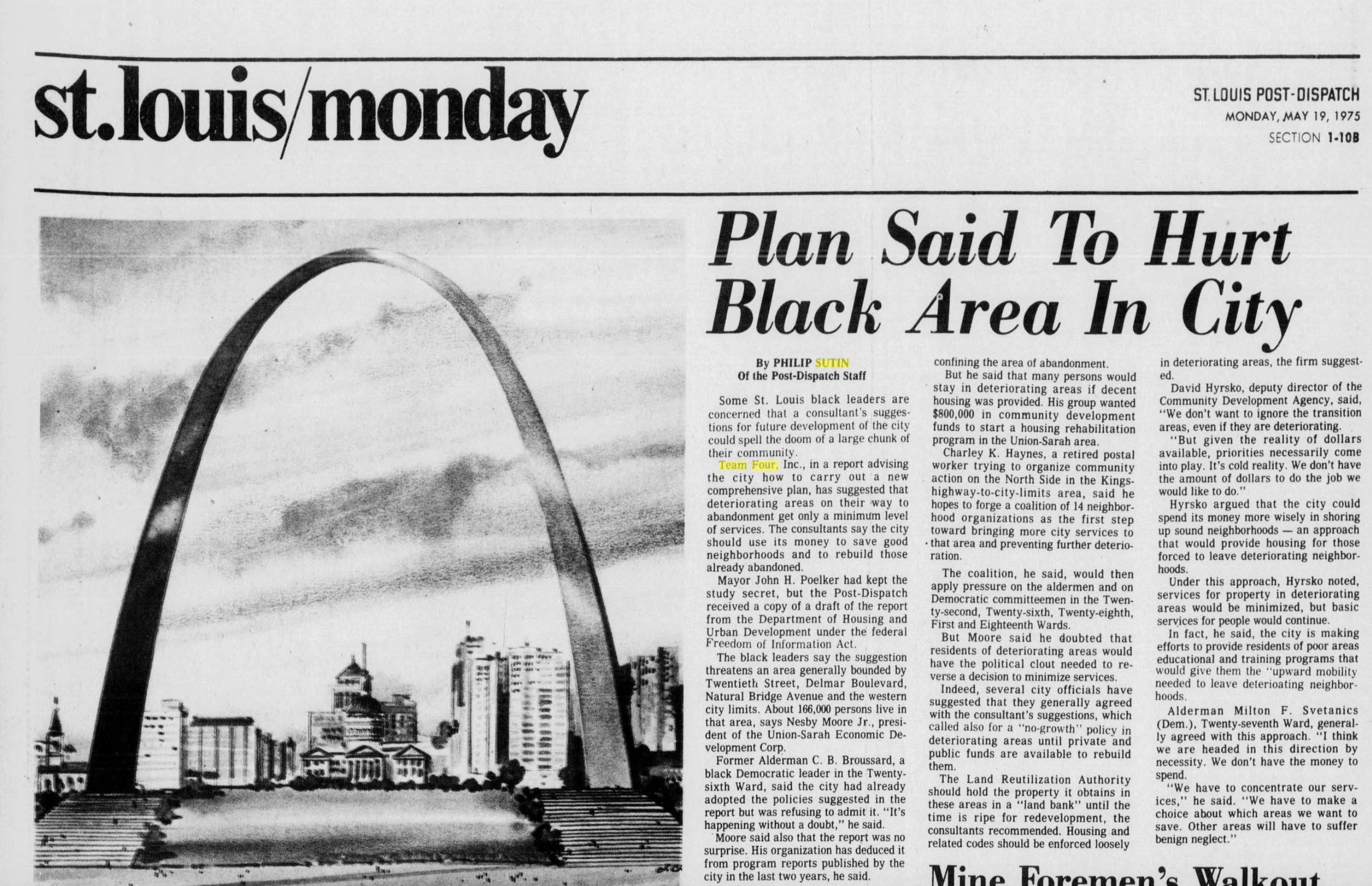 Meanwhile, north side political leaders, including Congressman Bill Clay, condemned the Team Four memorandum’s recommendations for suspending city service improvements and eventually basic delivery in what the firm termed “Depletion Areas.” When the fracas reached its peak, Team Four hid behind a frontispiece inside the finally-released memorandum stating that while the City Plan Commission had identified its geographies, Team Four had no specific areas of the city in mind and its protocols were only to be followed if a city planner identified “depletion” conditions in the field wherever they may be.