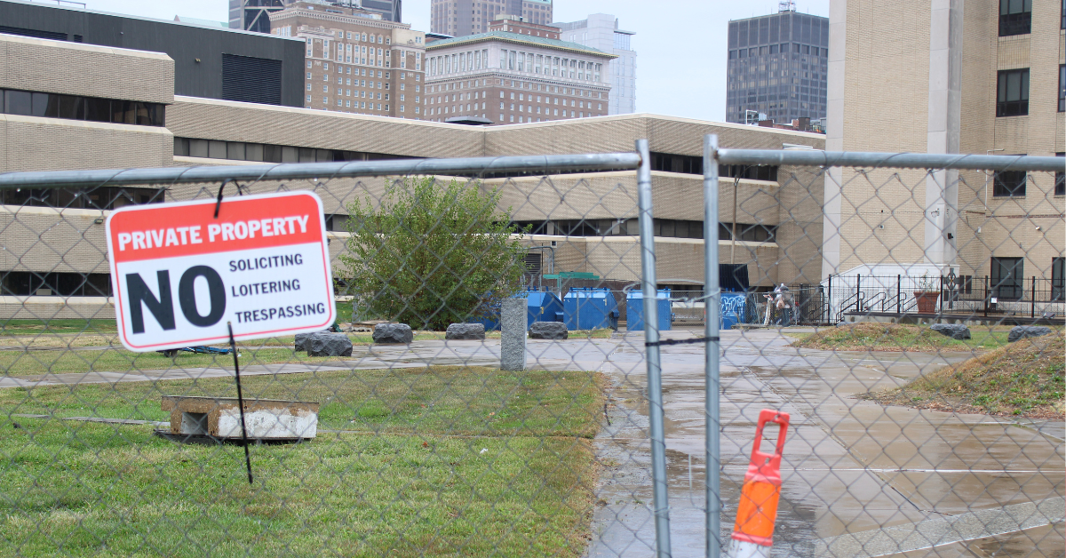 Interco Plaza has not been publicly accessible for four years, as the City barricaded the space after evicting a homeless encampment there. The plaza has sat surrounded by a dour chain link fence, with the St. Patrick Center on the south side. There is the visual contradiction of an attempted homeless strategy: restriction of unsanctioned dwelling and promotion of nonprofit providers. Whether or not this strategy best serves the interests of homeless people, it has induced several sites around downtown where temporary or semi-permanent fencing and barricades have stood. City Hall’s own lawn was fenced off by Mayor Lyda Krewson and remained fenced until Mayor Cara Spencer removed the fencing.