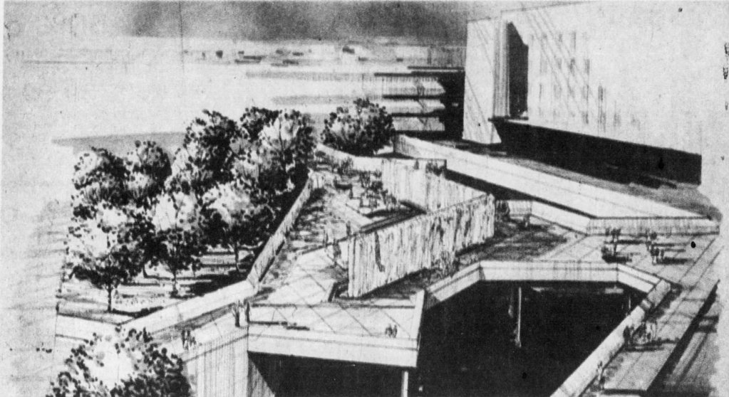 In 1969, the Convention Plaza Redevelopment Corporation first proposed rebuilding the area to the east of the newspaper buildings as an office area. Anticipating the construction of the original part of the current America’s Center (which opened in 1977 as the Cervantes Convention Center), developers pushed for new construction as well as the concealing of the railroad cut. In 1977, the engineering firm Sverdrup & Parcel—located in today’s St. Patrick’s center–proposed relocating to a new high-rise to the northeast. The project proposed the Interco Plaza as a hardscape public space concealing the still-active freight rail below. The plaza would not be a full lid, and would feature paths and benches with open ventilation shafts. Fountains concealed the walls around the cuts.