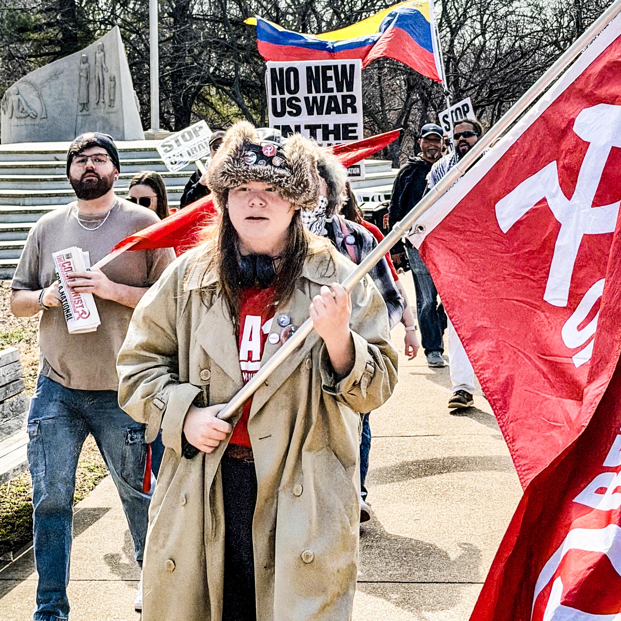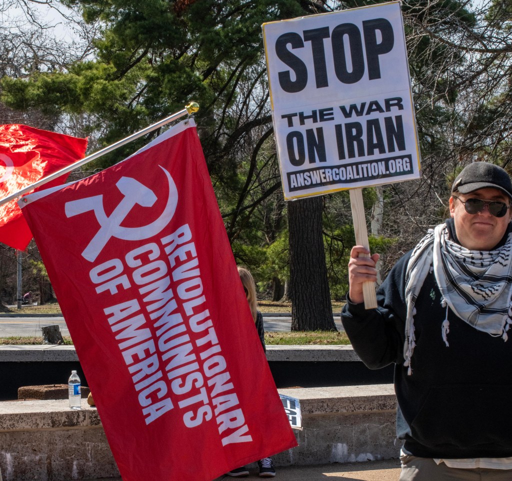 On Saturday, February 28th, around 50 St. Louisans mobilized at the Koplar Fountain in Forest Park to protest the unprovoked aggression against the Islamic Republic of Iran by the United States and Israel. The Party for Liberation and Socialism (PSL) and the ANSWER anti-war coalition called for the action. The groups’ call for action went out Saturday morning, less than four hours before people gathered.