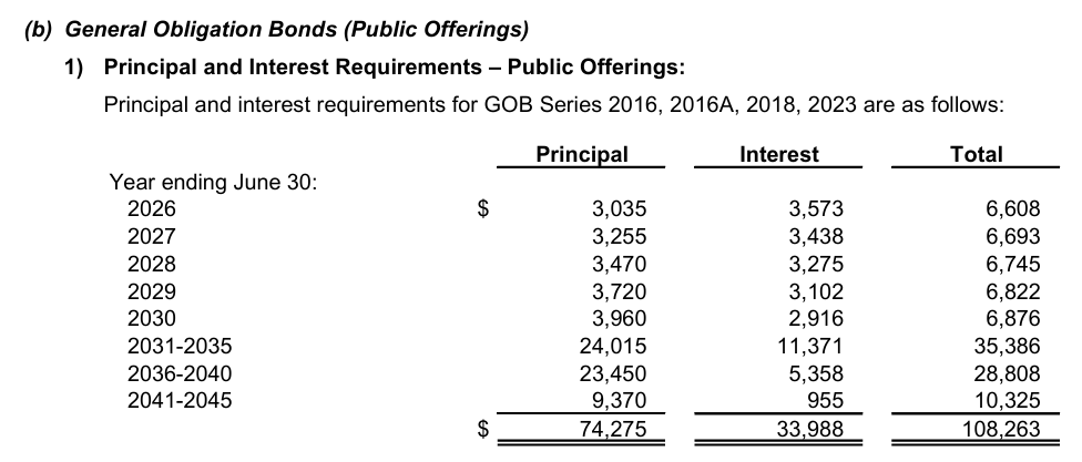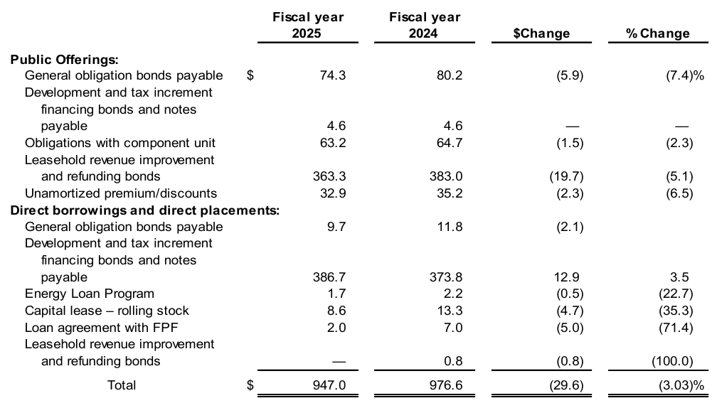The new ACFR shows that the city’s net position, the sum of the city’s assets and obligations, continues to improve. Over FY25, the city has seen an increase in its net position. In FY24, the city ended the year with a net position of $1.5B, while FY25 closed with an increase to $1.8B. This shows continued growth in the city’s net position, which ended FY23 at $1.2B.